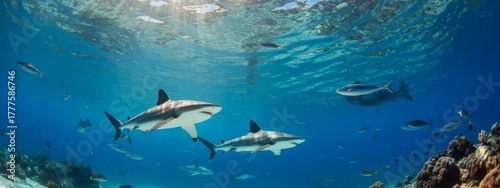 Underwater Scene with Sharks and Fish in Blue Ocean