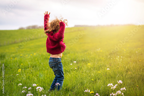 toddler, girl, little, lass, countryside, lea, field, sweater, jump, jump, flower, morning, raise, sun, jean, childhood, joyful, joy, luck, energy, vacancy, summer, ecology, environment, health, future, life