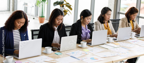Unidentified unrecognizable female successful businesswoman secretary operator in casual suit sitting side by side at working desk typing information on laptop notebook computer in company office