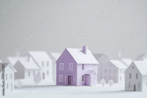 Unique miniature purple house standing out among other houses on a light grey background. Concept of real estate industry, choosing your new ideal home.