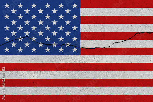 United States flag on concrete wall with crack