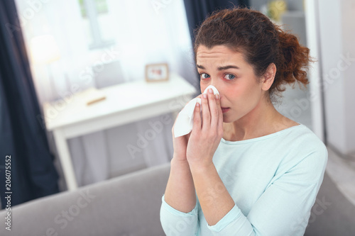 Unknown allergens. Sick lady looking perplexed while frowning her forehead wondering what sort of allergen provoked her allergic reaction