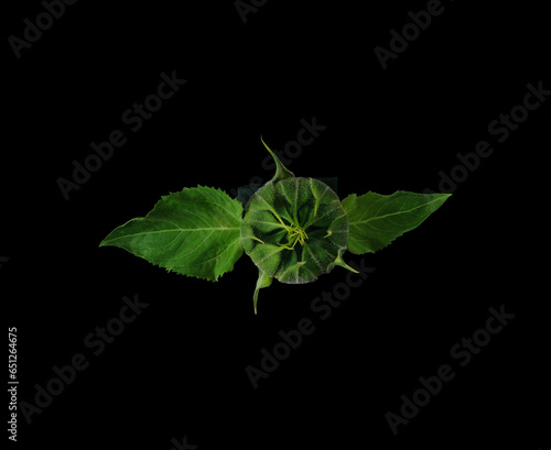 Unopened bud of sunflower on dark background view from above