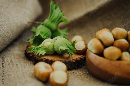 Unpeeled hazelnuts in a husk next to a bowl with hazelnuts in leaves and peel. Hazelnuts or cobnuts with leaves. Healthy food concept. Fresh harvest of hazelnuts.
