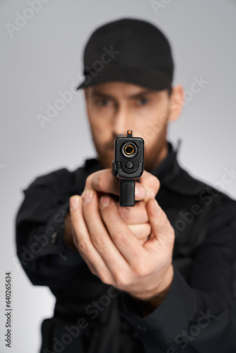 police, officer, gun, aim, handgun, barrel, cop, point, security, shoot, police officer, weapon, criminal, emergency, firearm, flashing, crime, taking, safety, holding, justice, work, law, confident, fire, constable, serious, danger, silhouette, man, closeup, enforcement, vertical, male, department, caucasian, closeup, uniform, bearded, grey, background, copy, place, blurred