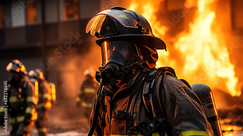 Unrecognizable firefighters in protective uniform and helmet with fire extinguisher standing near burning building. Generative AI