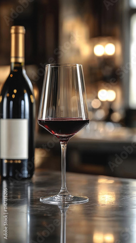 Upscale Dining Elegance: Red Wine Ready in Glass with Bottle in Soft Focus, Perfect for Banner or Social Media Story Post