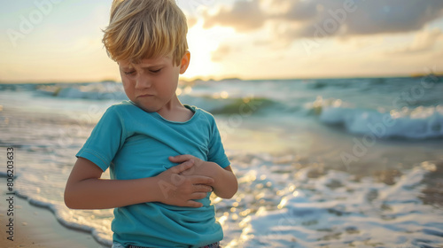 upset boy holding his sore stomach on the beach, diarrhea, poisoning, rotavirus, abdominal pain, tummy, sick child, kid, baby, sea, summer, illness, nausea, painful, ill, disease, stomach ache, health