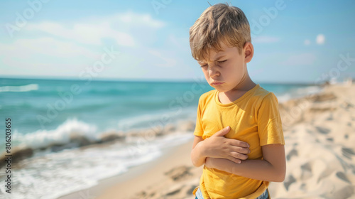 upset boy holding his sore stomach on the beach, diarrhea, poisoning, rotavirus, abdominal pain, tummy, sick child, kid, baby, sea, summer, illness, nausea, painful, ill, disease, stomach ache, health