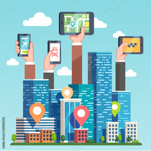 flat, icon, vector, object, illustration, template, background, design, cartoon, metaphor, clip art, concept, city, city landscape, building, urban, skyscraper, downtown, architecture, neighbourhood, district, banner, residential, sky, cloud, communication, smartphone, phone, computer, network, cyberspace, digital, mobile, web, online, wi-fi, transport, transportation, map, navigation, location, geolocation, travel, global positioning system, marker, plane, aeroplane, aerodrome, navigate, infrastructure