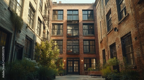courtyard, apartment, building, urban, sunlight, plant, brick, city, brownstone, loft, architecture, real estate, home, property, house, residential, exterior, design, interior, window, garden, green, nature, summer, sky, stone, wall, modern, old, vintage, light, shadow, space, room, luxury, view, scene, background, texture, structure, development, community, lifestyle, relaxation, peaceful