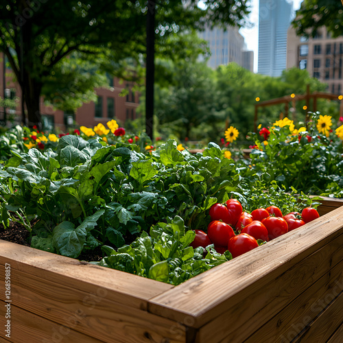 Urban Garden with Ripe Tomatoes and Leafy Greens