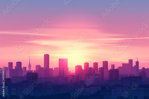 Urban skyline at dusk with glowing sunset, silhouetted buildings, anime style, serene twilight, wallpaper background