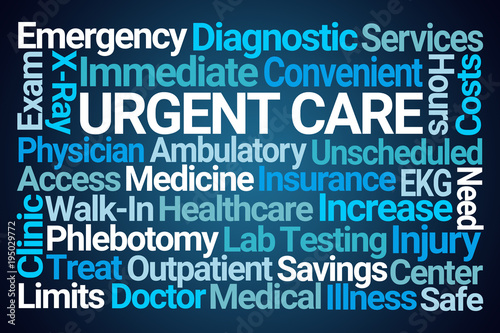 urgent, care, medicals, facility, emergency, center, treat, injury, disease, immediate, health, health care, increase, medicine, physician, doctor, public, wants, convenient, access, savings, diagnostic, exam, x-ray, insurance, cost, safe, service, limit, cardiogram, laboratory, testing, hours, blue, word, cloud, white, background