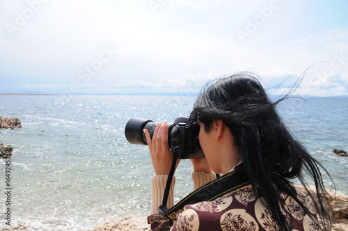 urlaub, erinnerung, strand, beach, koratien, kamera, fotografin, cameras, fotograf, frau, foto, linse, binokular, person, natur, anschauen, digital, himmel, einnahme, bild, leute, beach, anreisen, kin