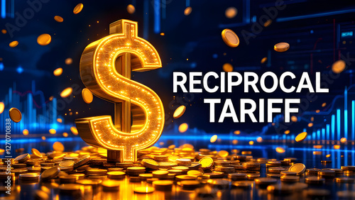 US dollar 3d gold symbol reciprocal tariff tax concept, Coins and world map in background, US economy tax on trading countries. Import tarrif