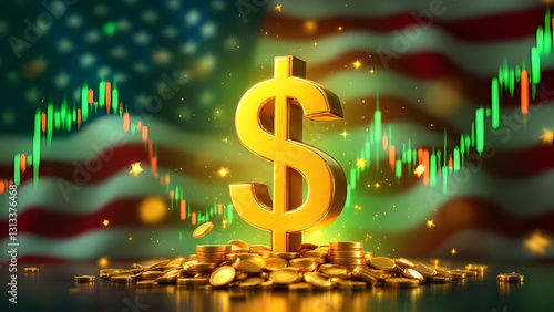 US economy growth charts with american flag double exposure, tariff, taxes, international trade.