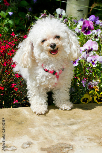 USA, Colorado, Summit County, Copper Mountain Resort. A teacup poodle poses in a flower bed.