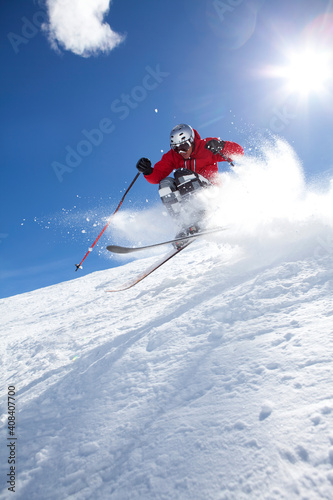 skier, speed, one person, downhill, winter, snow, skiing, ski slope, avocation, vertical, outdoors, day, mountain, vacation, full-length, warm clothes, us, colorado, clear sky, wintery, man, male, daytime, holiday