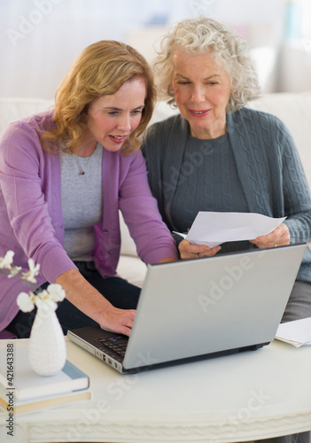 mother, daughter, technology, bill, sitting, talking, assistance, smiling, communication, finance, learning, relaxation, modern, sofa, cheerful, enjoyment, happiness, togetherness, comfortable, home, casual attire, living room, wireless technology, laptop, document, paper, vertical, indoor, day, helping, 70s, waist up, casual clothes, two people, new jersey, us, family, laptop, online, cyberspace, assisting, mother, mother, mother, mother, smile, communicate, relaxing, cheerfulness, happy, enjoy, enjoying, together, home, house, woman, female, people, wi-fi, daytime, help