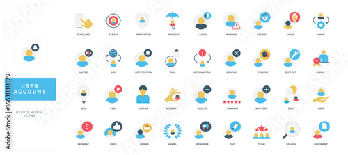 user, account, icon, flat, title, avatar, support, security, login, logout, summing, delete, ranking, badge, student, chat, team, search, document, payment, like, crown, award, reminder, edit, information, warning, muted, geo, scrolling, target, protection, protect, audio, locked, hand, task, remove, idea, play, isolated, vector, illustration