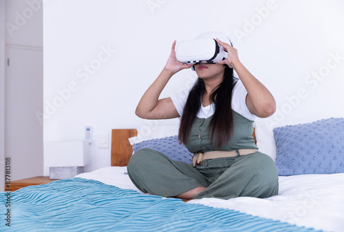 Using VR vr vr headset, woman sitting on bed in relaxed vacation setting