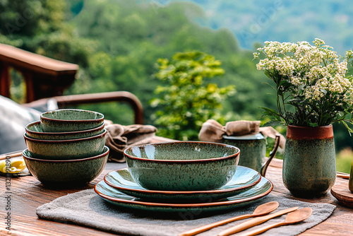 Vaisselle artisanale, bol et soucoupe, assiette sur la table dan le jardin