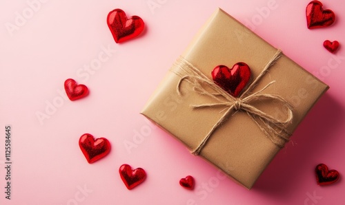 Valentine or mother day festive composition with gift or present box and red hearts on pastel pink background top view. Flat lay card.