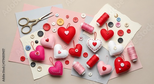 valentine, craft, sewing, supply, felt, nubes, buttons, thread, spool, scissors, hand-made, bricolage, hobby, creative, decoration, romantic, love, red, pink, white, assortment, arrangement, topview, textile