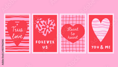 Valentines Day Minimal Poster Collection with Phrase. Playful Whimsical Simple Love Banners Cards Set with textured Heart shape and Text. Creative Vector illustration