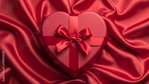 Valentine's Day red heart gift box wrapped in ribbon, placed on beige fabric for a romantic touch, generative ai
