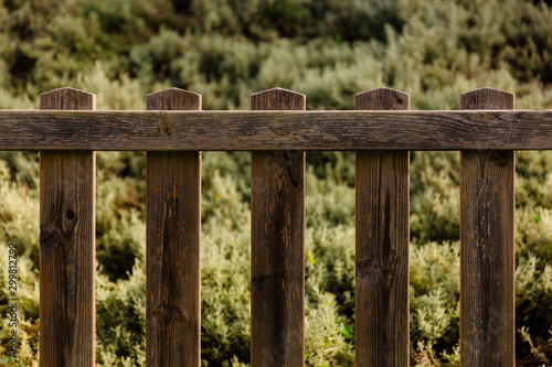 valla de madera delante de jardín verde parque. fondo atrezzo estudio