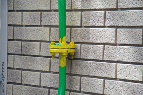 Valve on an old gas pipe in a residential area of a European city. Worn-out gas communications.