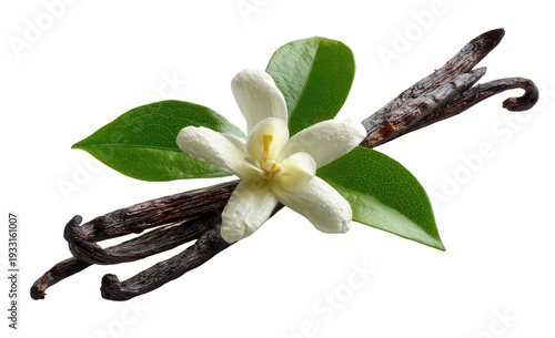 Vanilla bean pods and flower. Close-up, isolated on black