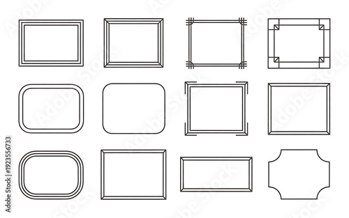 Variety of 12 outline frames featuring simple geometric shapes and decorative flourishes, ideal for invitations and digital design.