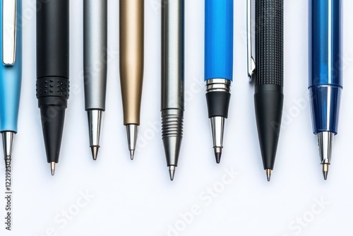 ball pen, pen, writing, stationery, blue, black, silver, gold, design, office, creativity, alignment, horizontal, plain, simple, education, business, art, tool, equipment, ink, plastic, metal, smooth, vibrant, elegant, classic, modern, composition, professional, minimal, clean, isolated, topview, high-quality, detail, texture, vintage, casual attire, stylish, colourful, accessory, purposeful, sharp, point