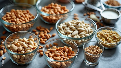 Variety of nuts and seeds in glass bowls on gray surface