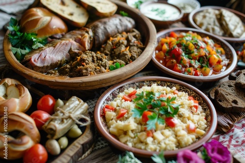sausage, ukrainian, bread, food, traditional, dinner, background, art, homemade, table, meat, cookery, bowl, comfort, rustic, european, tomatoes, parsley, healthy, culture, top, photo, meal, variety, eatery, cooking, tablecloth, view, delicious, plate, lunch, dish, culinary, indoor, cooked, nobody, gastronomy, presentation, heritage, styling, potato, cultural, menu, eastern, embroidery, hearty
