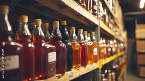Various bottles of liquid neatly lined up on shelves in a warehouse, illuminated by soft overhead lighting.