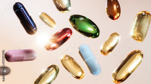 Various colored capsules and pills floating against a soft background