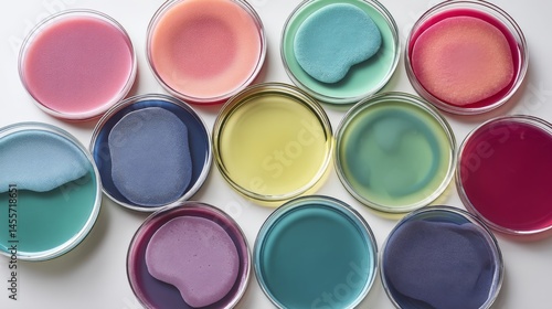 Various colorful liquid cultures are neatly displayed in petri dishes on a clean clinical white table, offering an organized composition for scientific use