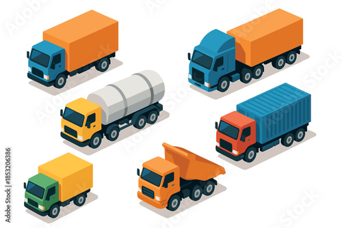 Various isometric cargo trucks and commercial vehicles are depicted in a colorful collection, representing diverse transportation, logistics, and delivery services.