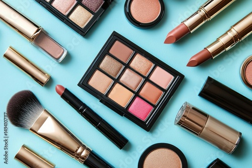 Various makeup products including eyeshadow palettes, lipsticks, a makeup brush, and a foundation bottle arranged on a blue background, evoking a sense of beauty and elegance