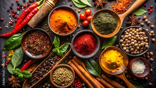 Various spices and chili peppers arranged on a dark textured surface