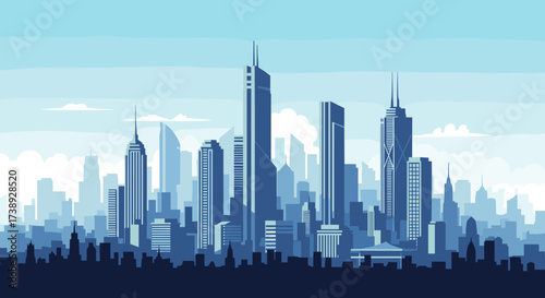city landscape, modern, urban, architecture, skyscraper, building, metropolis, skyline, blue, horizon, city, downtown, business, financial district, corporate, tower block, tall building, city view, perspective, background, illustration, graphic design, digital artwork, scene, environment, setting, atmosphere, daylight, clear sky, minimalist, futuristic, commercial, development, planning, growth, progress, economy, center, district, region