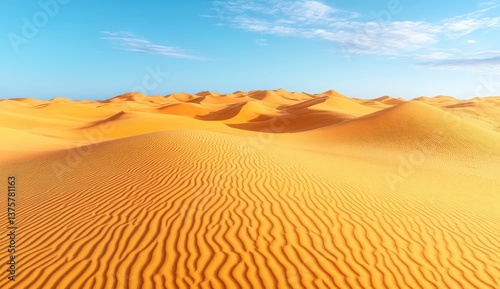 Vast expanse of golden dunes under a vibrant blue sky. Rolling sand hills stretch to the horizon