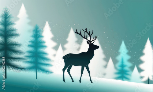 Vector abstract design template from Christmas background with raindeer winter forest, snow in turquoise and gold colors.
