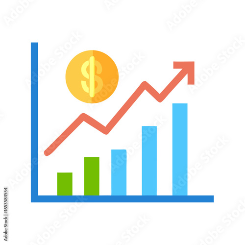 Vector art of a colorful flat illustration shows a financial graph with rising bars, an upward trending line, and a dollar coin, symbolizing business growth and profit