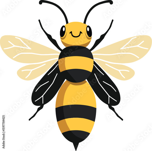 Vector art of a friendly cartoon bee with spread wings hovers, isolated on white background