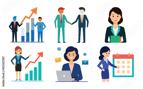 Vector art of business professionals engaged in activities like handshaking, presenting growth charts, and calendar planning, isolated on white background